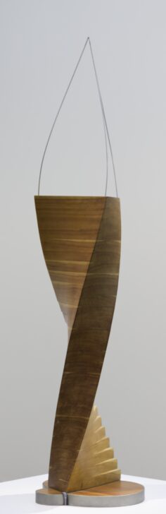 A curving triangle made of layered pieces of wood. At the top of the wood, a metal rod extends from each corner and all three rods connect in a point at the top of the work.
