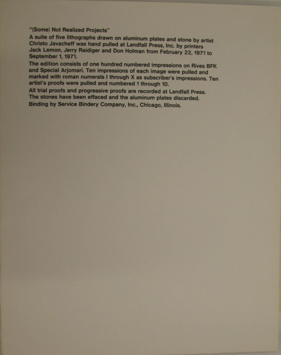 This work is the documentation sheet for a portfolio of lithographs created by Christo. The lithographs represent preparatory drawings and photographs for an unrealized project Christo had initially planned in 1968. For the project, Christo and Jeanne-Claude were going to wrap the MoMA as well as the Abby Aldrich Rockefeller Sculpture Garden, install an inflatible sculpture in the Garden, and build a Wall of Oil Barrels on 53rd street. In the end, because the museum's insurance company would not continue to cover the museum while it was wrapped, the museum agreed to create an exhibition of the prepatory materials for the project entitled Christo Wraps the Museum: Scale Models, Photomontages, and Drawings for a Non-Event.