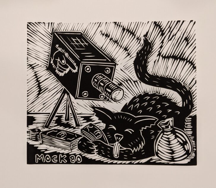 Printed in black, a cat with its tongue out and its tail held up in the air wraps its paws around a stack of bills. There is another stack of bills and some coins on one side of the cat, and a bag on the other. A rectangular box with an eyepiece and on a tripod is pointed at the cat, and there is hand with a pointed index finger illustrated on the side of the box. In the bottom right corner, "MOCK 80' is printed in block letters.
