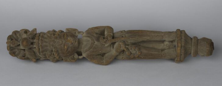 Carved wooden architectural fragment consisting of a standing figure, smiling and wearing a large headdress and large earrings. It holds a rope or staff in both hands. A square hollow is drilled or carved into each shoulder.