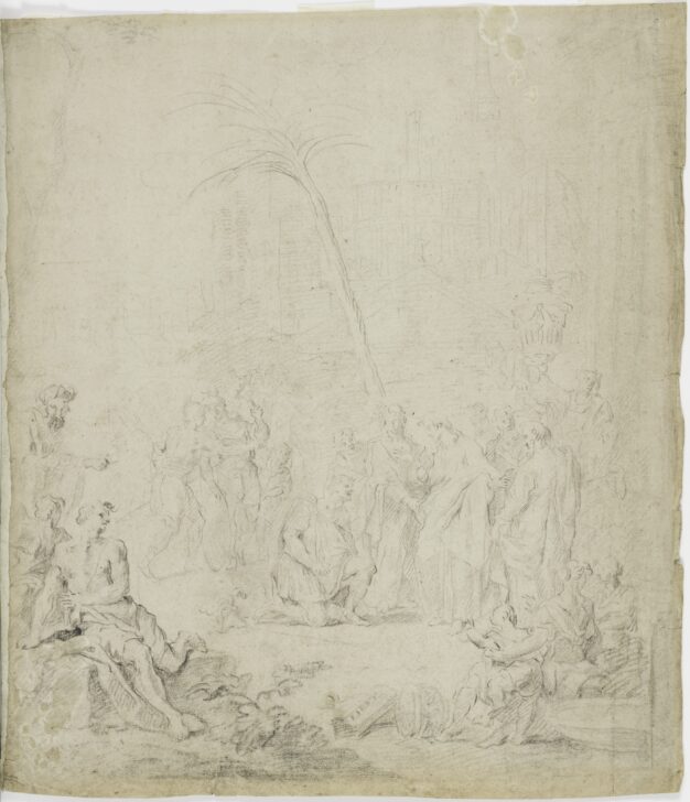 A black and white image of people gathering in a park. A bare chested man sits on a stone to the left, while a child plays to the right. Other individuals, including bathers, congegrate beneath a tree. In the background, a large structure is visible.