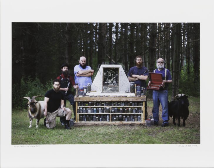 Five men and two goats standing around wooden shelves in a forest. The shelves are lined with jars filled with nails and the men hold tools.