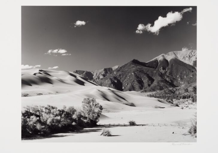 A wide sand dune in shadow stands against the horizon. At its feet, an expanse of more sand, dotted with occasional brush, fills the rest of the image.