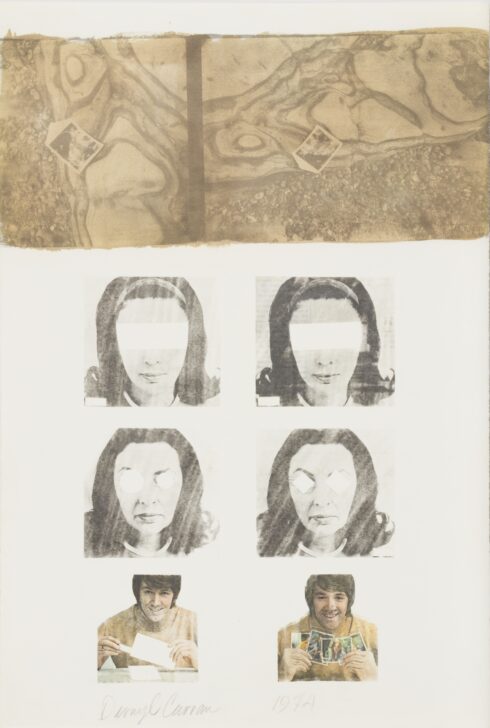 A collaged photograph in brown hues featuring a mottled brown stripe above photographs of four women and two men. The photographs of the women are in brown hues and the photographs of the men are multi-colored.