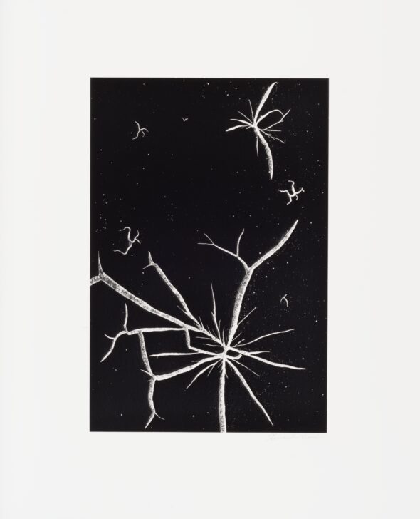Intersecting white lines crack into smaller lines, forming a starburst shape on a black background.