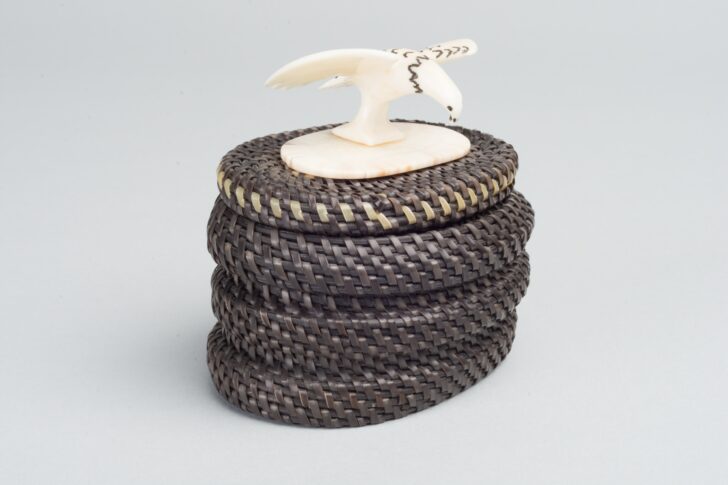 Brown woven basket and lid topped with a painted ivory eagle with wings outstretched.