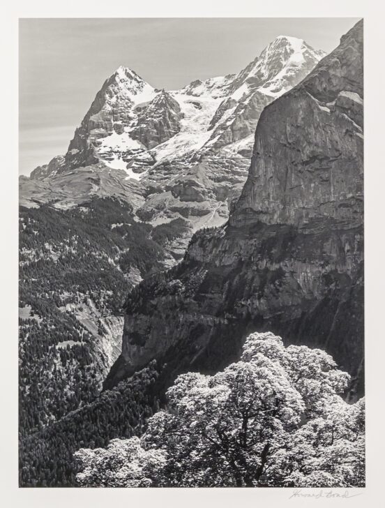 Two snow-covered mountain peaks, the right slighter higher, fill the background of this image. The foreground features the top of a wide, leafy tree, which stands against the dark, leveled shape of a mountain cliff in shadow.