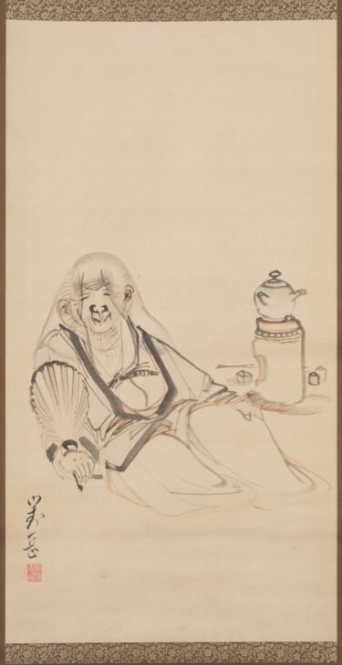 A scroll painted with the image of a robed man sitting in front of a teapot.