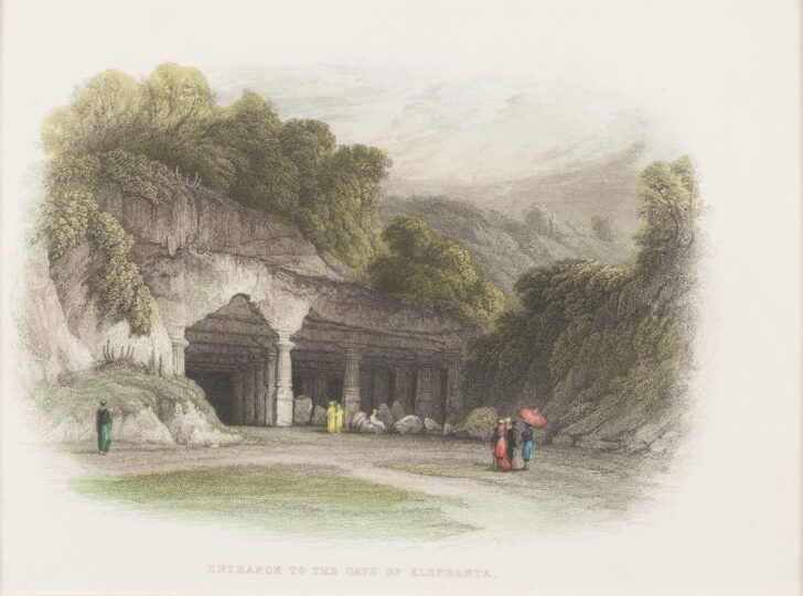 Seven figures stand at the carved entrance to a cave. One in blue at the left, two in yellow at the center, and four to the right in red, black, and blue. The last figure, in blue pants, carries a red parasol.