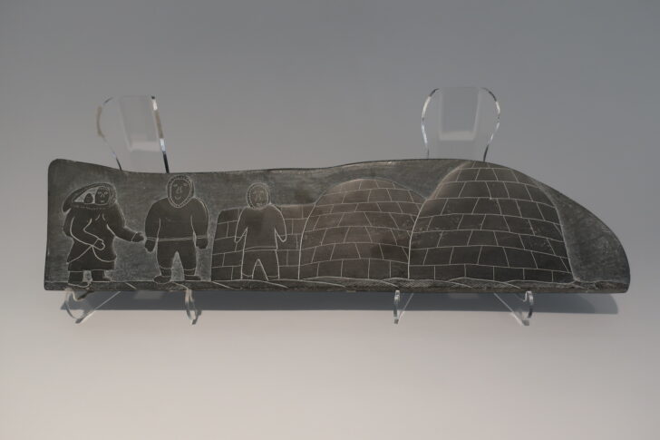 Double-sided stone etching. One one side there is a scene of a hunter on a dogsled hunting a bear. On the other side, there is a scene of three people in parkas standing by igloos.