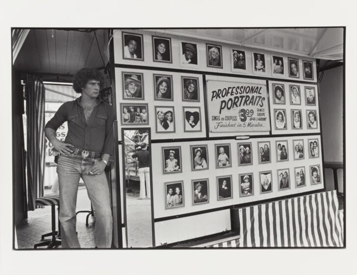 A black and white image of a man standing next to a wall covered in photographs with a sign advertising professional portraits.
