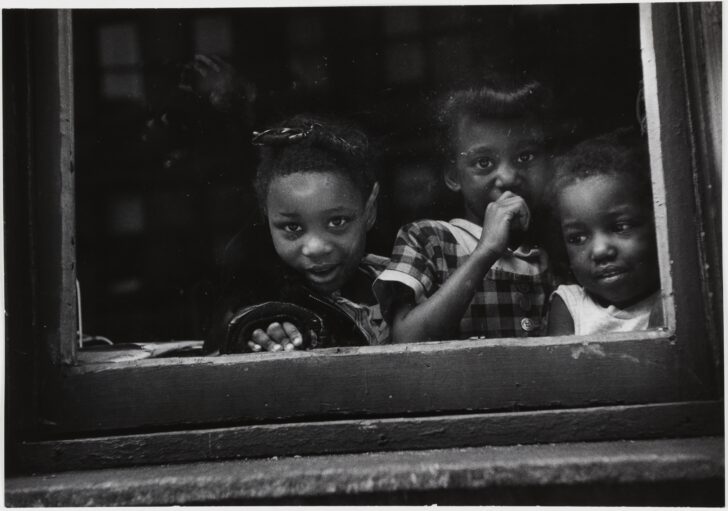Three girls look through a dark-framed window. Two look directly at the camera, while the third looks off to the right. The middle girls holds her hand up to her face, obscuring her mouth.
