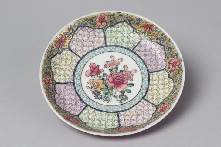 Overall floral pattern with floral motif in center. Green, purple, yellow and gold in center.
