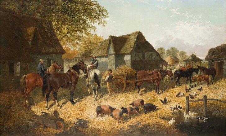 A farm scene depicting three men, horses, pigs, and a wagon. There are ducks in a small body of water in the foreground and buildings with thatched roofs in the background.