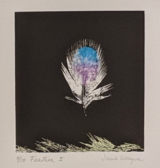 A white, blue, and purple feather centered on a black background. There are feathery shapes that look like grass along the bottom edge.