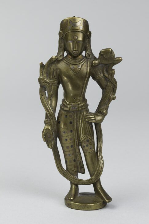 A standing figure on a circular base with its left hand on its hip and its right hand hanging to its side, palm facing outward. It wears a headdress decorated with a half-moon motif. Lengths of necklace hang from the neck with additional jewelry hanging to the ankles. The figure's legs are covered in clothing bearing repeated patterns of blue and orange.