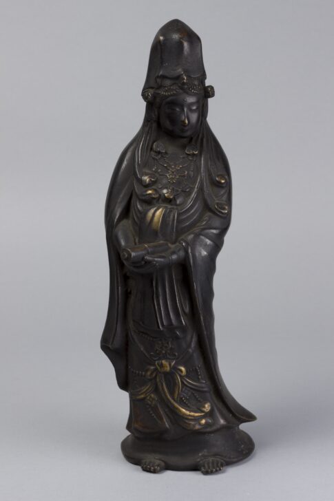 Bronze male figure, legs are slightly slanted, he is wearing a robe and hat.