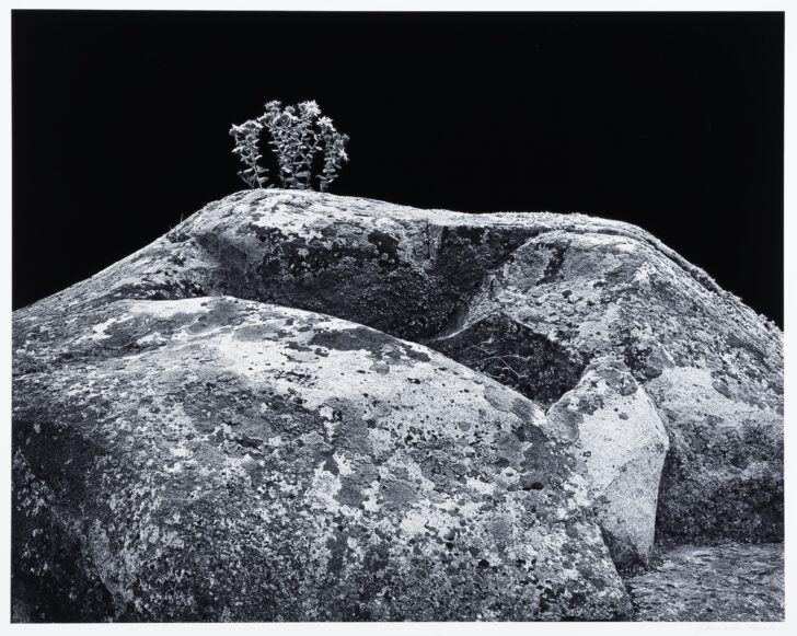 A rounded boulder sits against a black background, covered in a variegated, circular pattern of lichen and moss. A clump of tough, flowering plants grows just above the boulder's top right edge.
