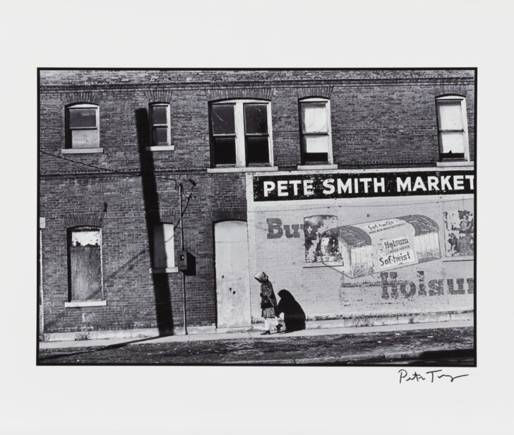 A black and white photograph of a figure wearing a coat and head scarf, walking next to a large brick building. A large sign reads "Pete Smith Market" under which is a bread advertisement.