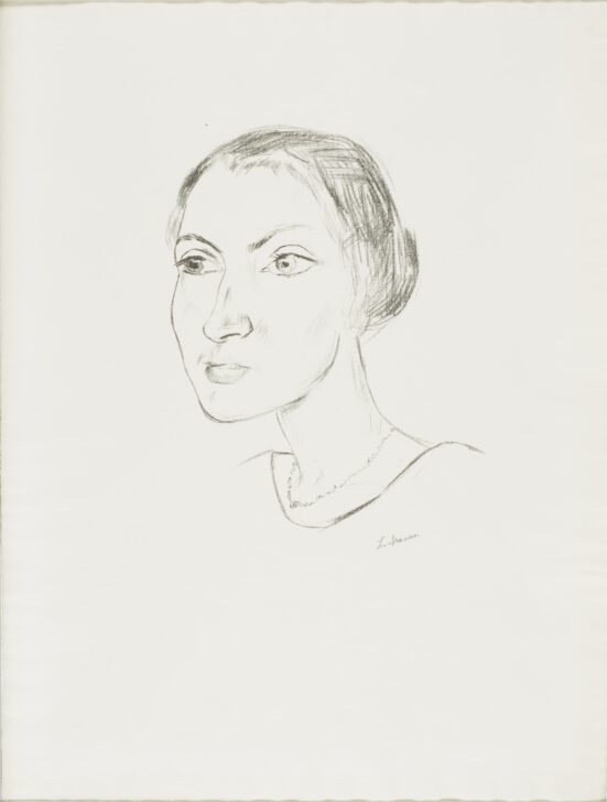 A portrait of a young woman from the collar up, a thin necklace visible around her neck. She looks to the viewer's left, and wears her hair in a bun.