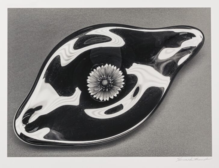 A dark but highly-polished dish holds the head of a single stemless flower.