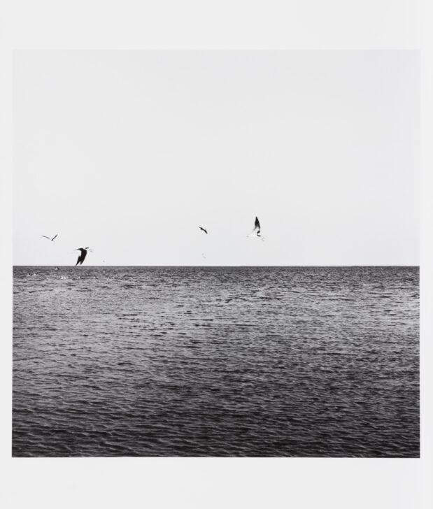 A black-and-white image of the horizon meeting the water with birds flying just above the water's surface.