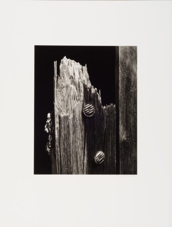 Two nails placed into two thin metal circles are nailed into a wood plank with its top section torn away.