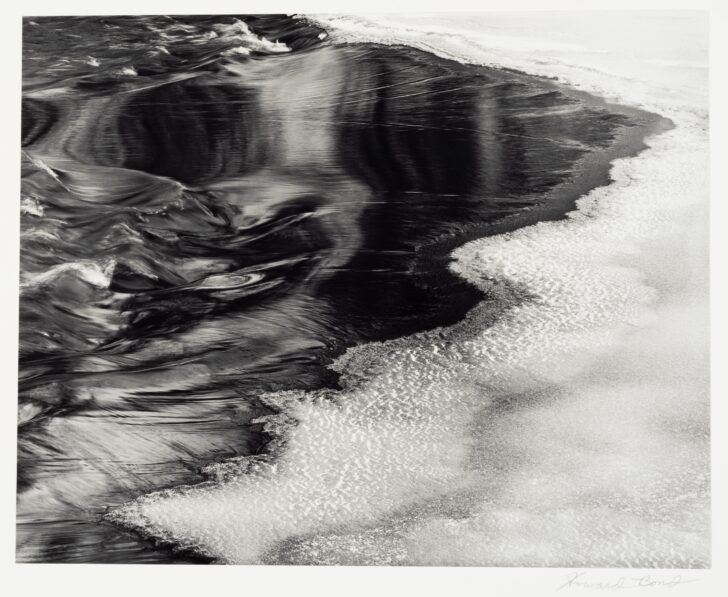 Water moves from left to right in darkly shining sheets, hitting a shore of snow-dusted ice.