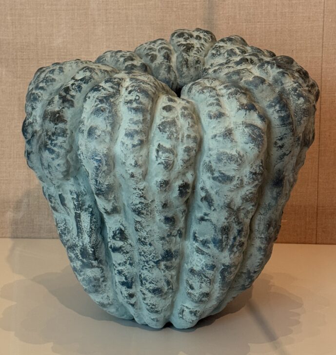 Mottled green and black sculpture with rounded ridges extending upwards.