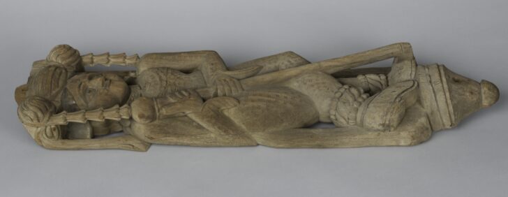 Carved wooden architectural fragment consisting of a figure wearing decorative-sleeved clothing, standing with legs crossed and holding a staff.