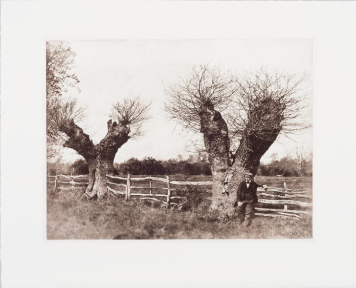 Two trees with thick stumps dividing into two stand before a simple wood fence. A man sits next to the three on the right, resting his left arm on the fence.