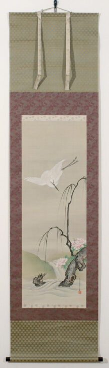 Peonies are a symbol of bravery and honor while the heron is a symbol of good luck. The heron is commonly found in many Japanese arts. The theme of flower and bird paintings is popular in Japanese art.