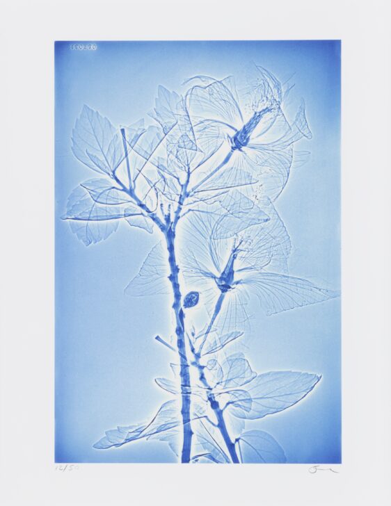 A color photograph featuring a plant form. There are two tall stems in dark blue and faint leaves coming off the stems. The background of the image is a pale blue.