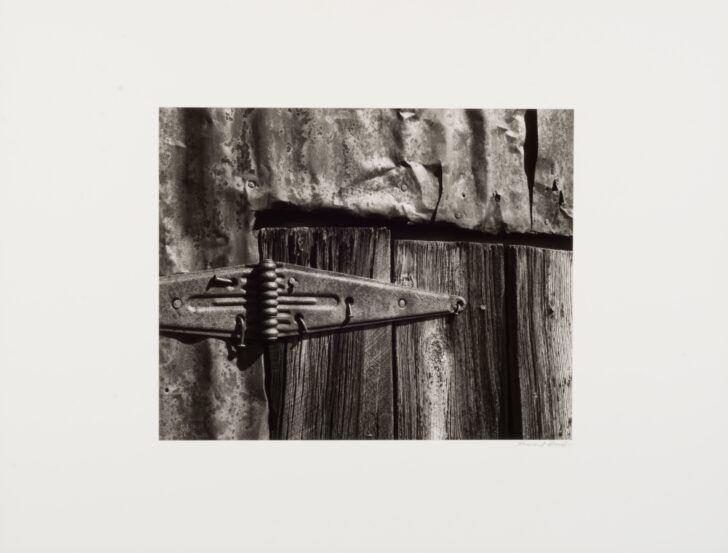 The top right corner of a door formed by rough wooden planks. A metal hinge is bolted into the wood and the thin metal that covers the structure surrounding the door.