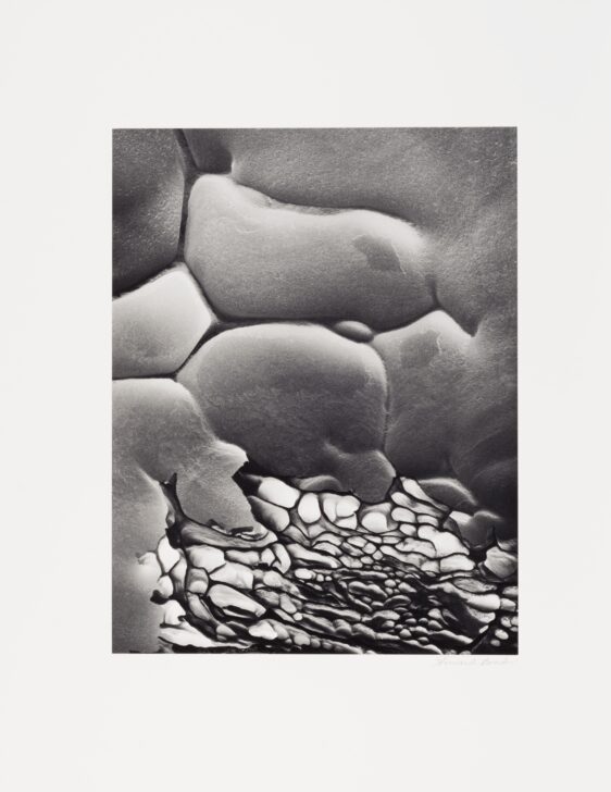A wall of smooth rock appears to be composed of boulders that have melted into one another. Smaller, lighter, sharper rocks form its base.