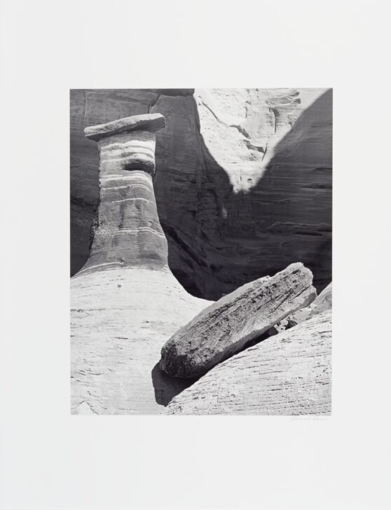 An oblong stone lies on a sloping rock surface made of thin, rough layers. Behind it, a pillar of thin layers stands against a rock wall in shadow.