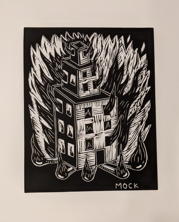 Printed in black, layers of flames engulf a multi-storied building. Beneath the building, five flaming matches stick out. "MOCK" is printed in block letters in the bottom corner to the viewer's right.