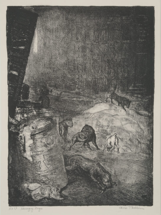 Pack of dogs scrounging for food in an alleyway, overflowing trash can in left hand side.