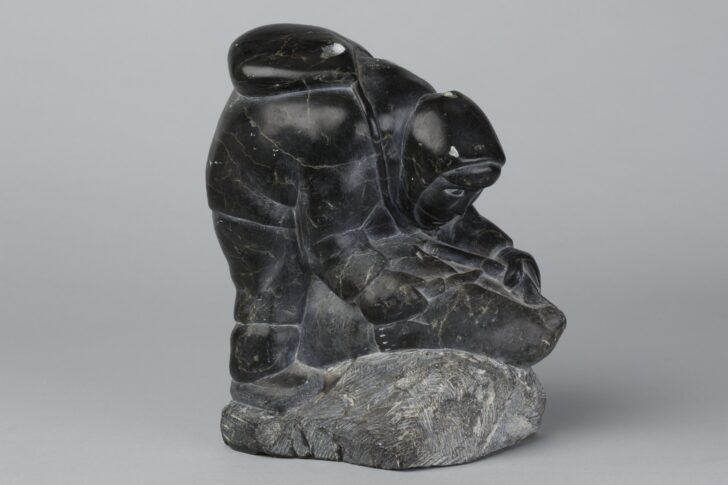 Hunter and seal carved from a single stone. The hunter wears a hooded coat and leans over the seal with a knife.