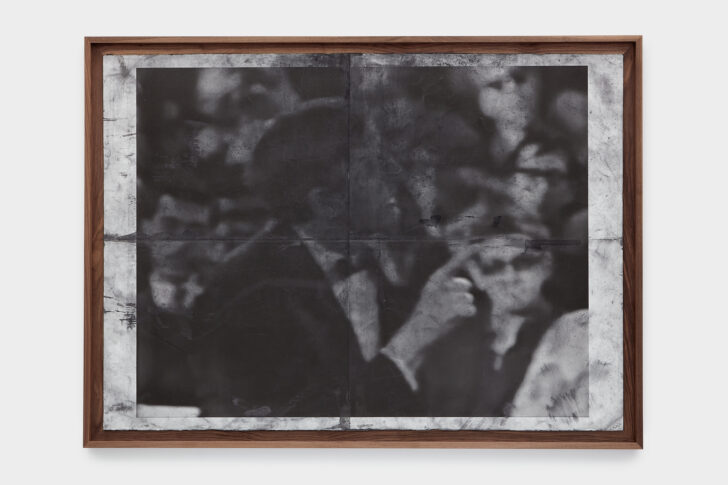 A black and white photograph of a man in a suit and bowtie mid-speech, his finger pointed at something out of frame. The surface of the photograph is obscured by smudged graphite.
