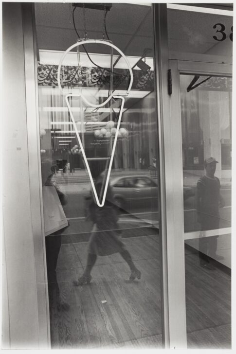 A black and white image of a neon ice cream cone sign in a window. The window reflects a passing car, a building, and three people including the photographer.