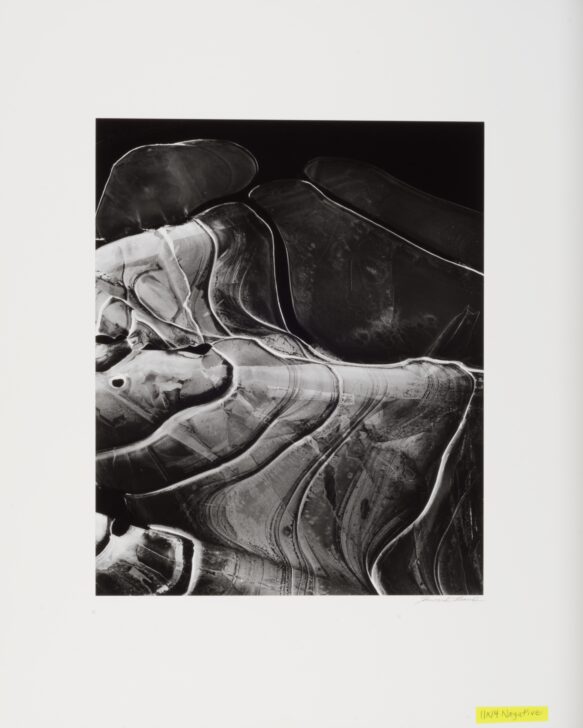 A close view of ice frozen into twisting white lines, resembling topography photograhed from above.