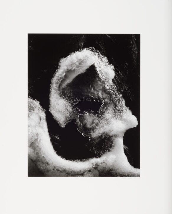 A close-up of ice frozen into a curl of hard froth and thin, translucent crust.