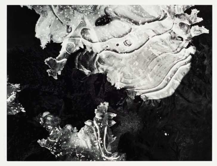 A curving white form floating in a dark field is cut through with thick dark lines, its bottom edges ending in cilia-like points. To its right, a smaller form of darker but similar structure is found.