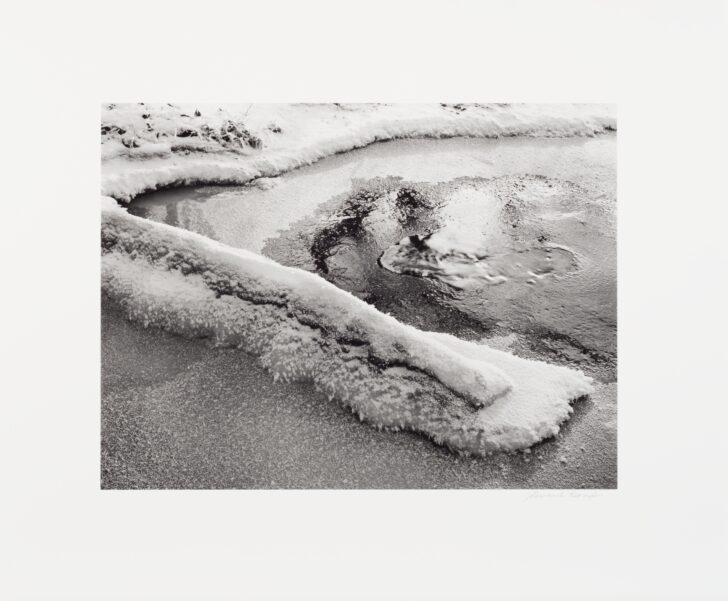A triangle of sand forms where a fallen branch meets higher ground. The triangle is half darkened by water, half dusted with snow.