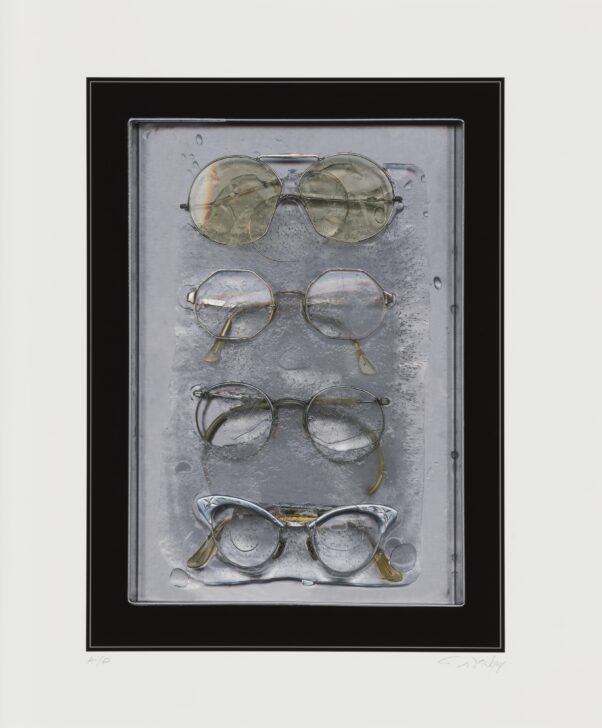 Image of a column of four pairs of eyeglasses in a wet edged tin.