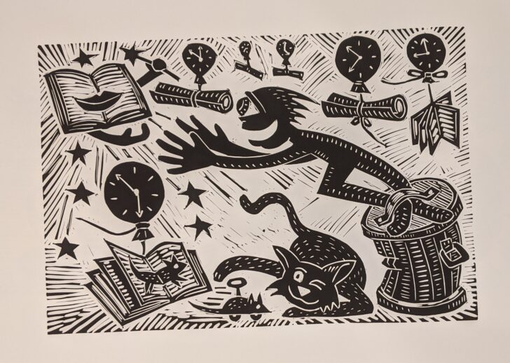 An abstract print in black, a figure standing on a trash can reaches towards an open book that has lips and is holding a wand with a star on the end with more stars around it. The figure leans over a winking cat that is reaching towards a wind-up mouse, and balloons with clocks telling different times drift in the background, each carrying a rolled paper or an open book. One of these open books is prominent in the lower left corner and depicts a four-legged animal with a tail.