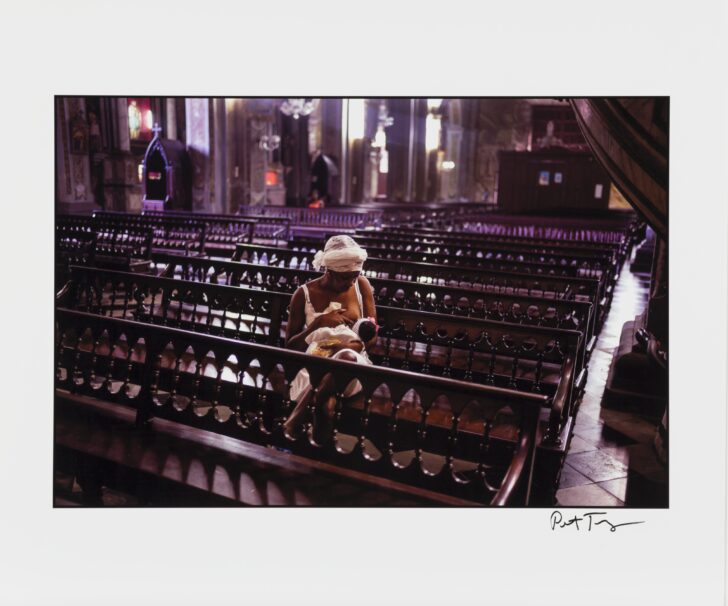A color photograph of a woman sitting in a church pew breast-feeding a baby.