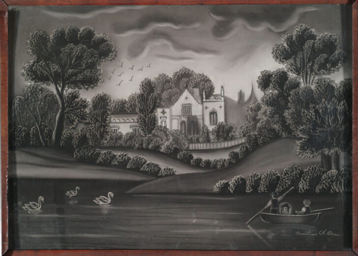 Caroline Beam was active in New England during the middle of the nineteenth century. Landscapes like Italian Villa were popular during this period as fashionable elements to display in the home. Demonstrating popular romantic perceptions of the wealthy, this work reveals middle and lower class views of the period. The monochrome grisaille technique was considered elegant during the nineteenth century, which further contributes to the romantic interpretation of the subject matter.