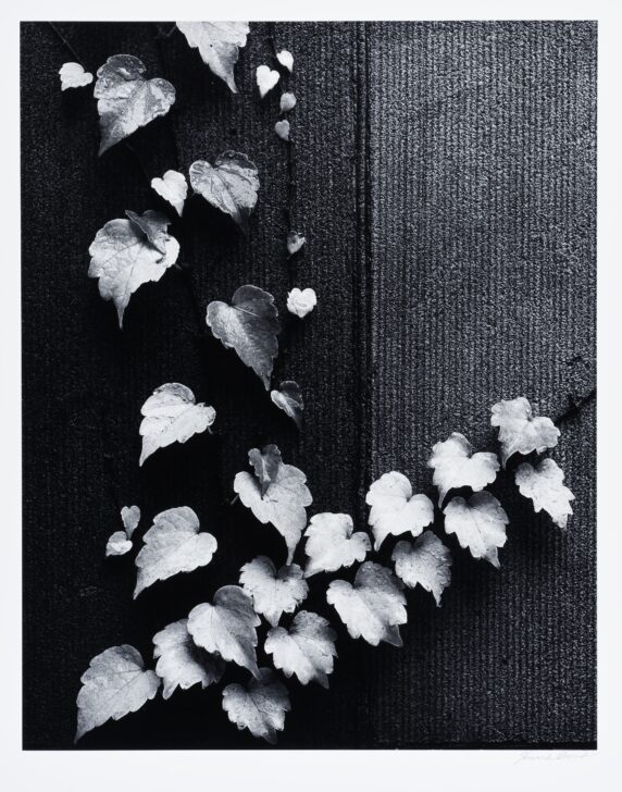 A few strands of ivy vine grows across a dark surface of parallel ridges.